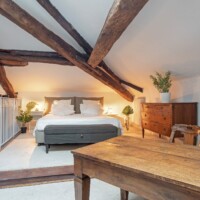 Composizione: 1 camera da letto, con letto matrimoniale king size, caratterizzata dal caloroso soppalco con travi a vista. Dotata di un ampio salone affacciato sul parco e un ampio camino storico in pietra.